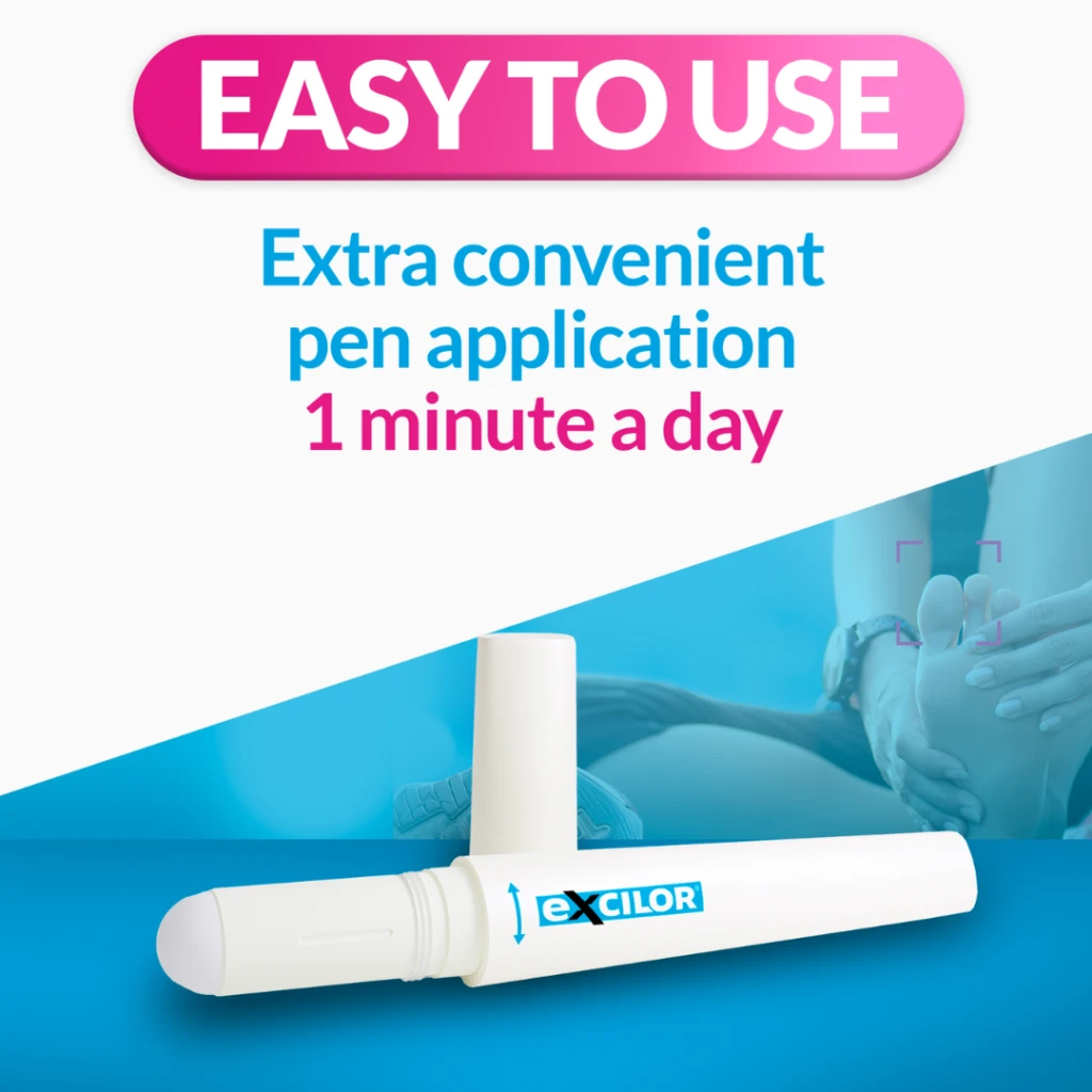 Excilor Nail Fungus Treatment Easy Pen is designed to be an effortless and effective nail fungus treatment. Simply use the easy-to-use pen applicator once a day. As it only takes one minute per day to use, users find it convenient and easy to integrate into their daily routine. Once applied the formula dries within seconds without leaving a visible film. This fast drying enables you to get on with your day quicker. The applicator's new innovative design prevents evaporation between uses and has a firm soft precision tip meaning no breaking. This user-friendly approach, combined with its clinically proven efficacy, makes Excilor Nail Fungus Treatment Easy Pen a preferred choice for those seeking a practical & convenient solution to treat nail fungus, even when on-the-go! Its TransActive™ Penetration Technology allows the product to penetrate the nail bed and create an environment hostile to fungal growth, inhibiting further infection and promoting healthy re-growth of the nail. The formula contains an optical whitener and is designed to improve nail smoothness and reduce dryness. Enriched with glycerol, nail care lipids and biotin, Excilor hydrates and nourishes the nail plate, supporting nail repair and helping to restore healthy nails.