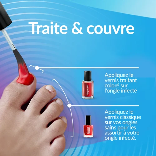 - Contient un vernis Excilor® Forte Color pour traiter les ongles infectés (30 ml) et un vernis à ongles cosmétique de même couleur pour recouvrir les ongles sains (8 ml) et accorder l'ensemble de vos ongles.