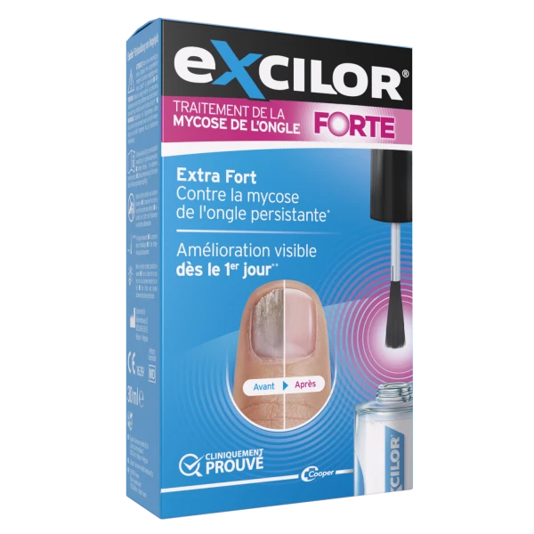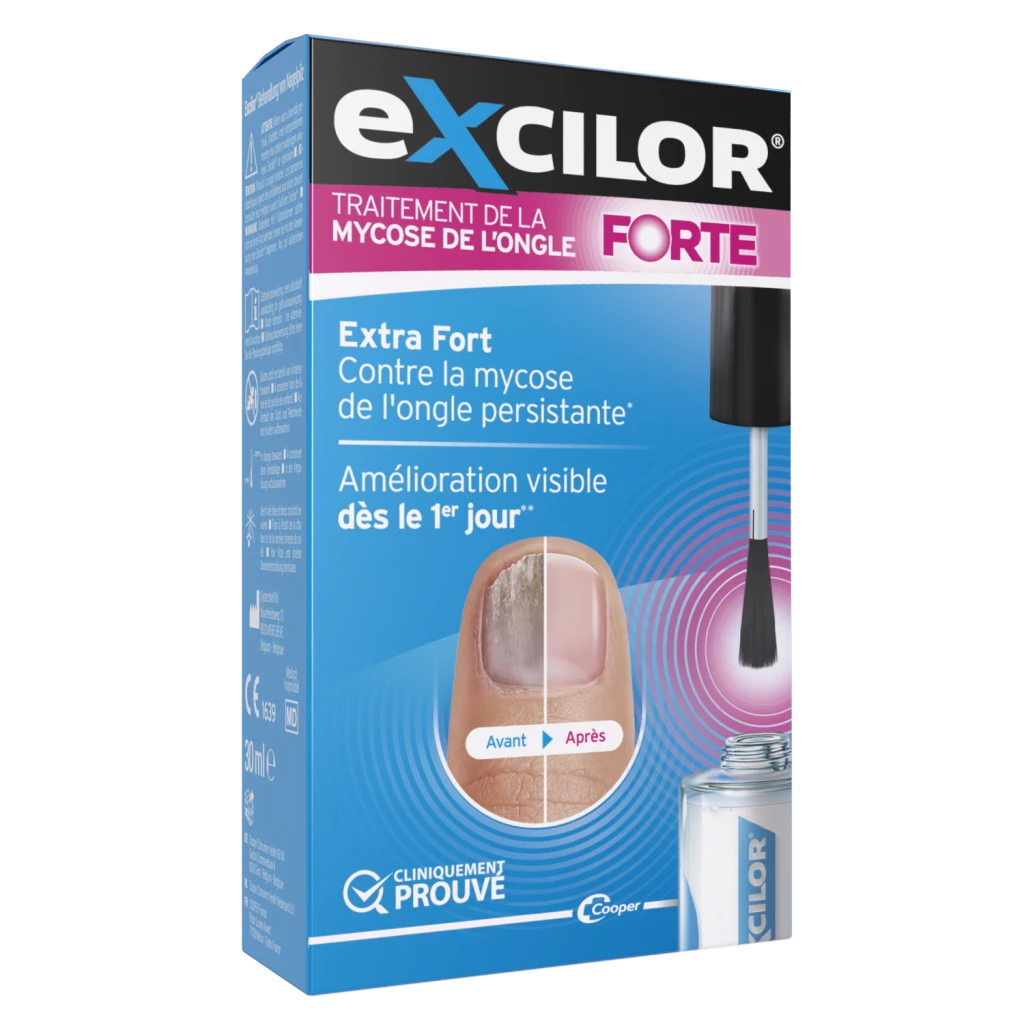 Excilor® Traitement de la mycose de l'ongle Forte est un dispositif médical pour le traitement de la mycose de l'ongle de main ou du pied. Fabriqué par Oystershell NV. Lire attentivement les instructions figurant dans la notice avant utilisation. Demandez conseil à votre pharmacien ou médecin. Ce dispositif médical est un produit de santé réglementé qui porte, au titre de cette réglementation, le marquage CE. Coopération Pharmaceutique Française - Place Lucien Auvert - 77020 Melun Cedex - France R.C.S. MELUN 399 227 636 . V00 - Avril 2024.